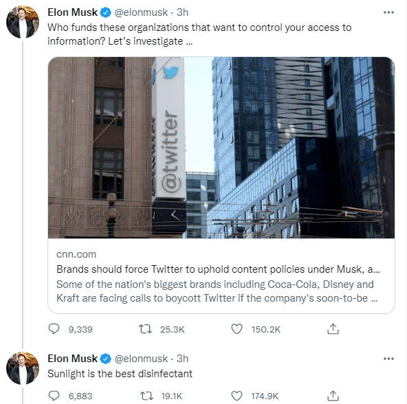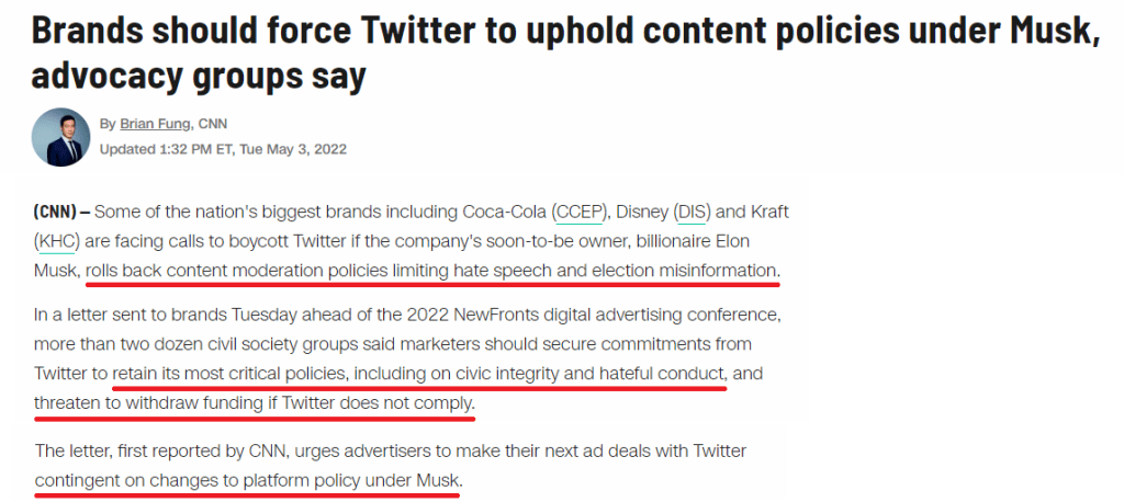 So according to this article, these desperate hacks on the left are encouraging big brands like Coke, Disney, whoever, to put the squeeze on Musk in order to keep him in line. Are you tracking with me here? They want to force Musk to keep the status quo of censorship at Twitter. What they call hate speech is just code for anything conservatives say that the left doesn’t like. And what they call election misinformation is actually when someone factually reports the truth and goes against the leftist narrative. See how this works, folks?