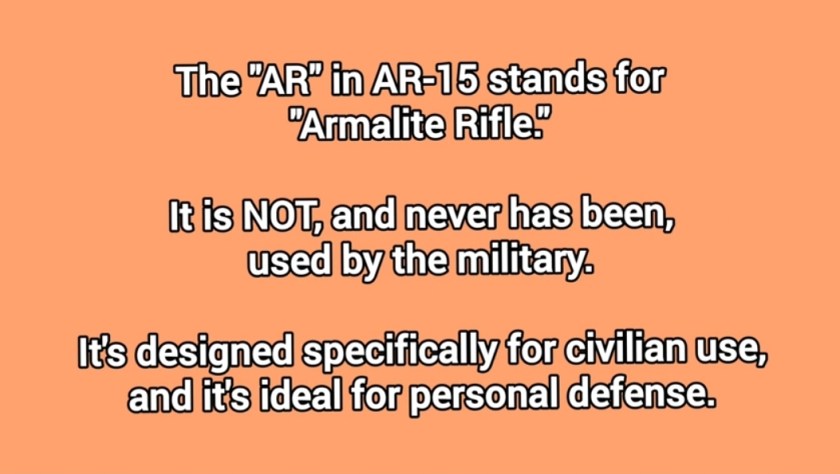 None of this matters to the whackos advocating for gun bans. Nor does the fact that criminals – by definition – don’t obey laws. Still, they point to what they call “assault rifles” – like the AR-15 – and claim no one should own it because it’s a military grade weapon. False. The AR-15 is not and was never used by the military. It’s also not automatic, but rather semi-automatic. Furthermore, AR does not mean “assault rifle.” It actually stands for Armalite Rifle, and the AR-15 was specifically designed for civilian use. What’s more, it’s a great choice of weapon for personal defense due to its easy handling and efficiency.