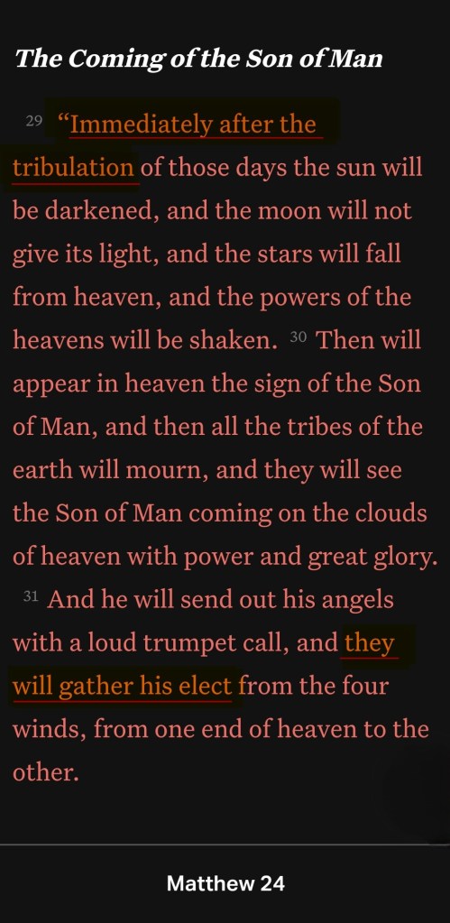 That last verse there talks about what we call the rapture, the angels gathering up God’s people from all over the earth. And WHEN does it say this happens? “Immediately after the tribulation.” That’s not my opinion. That’s precisely what the Bible says.